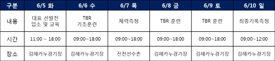 선수들은 5일 경남 김해 카누훈련장에 입소해 카누용선 기초훈련으로 일정을 시작한다. 기초 훈련을 마친 선수들은 7일 진천선수촌으로 이동해 스포츠 과학지원센터에서 체력측정을 하고, 8일과 9일 최종 종합 훈련을 마친 후 10일 최종 기록측정을 통해 선발전 테스트를 마무리 한다.