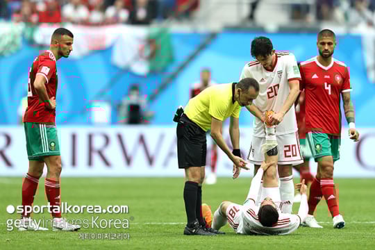 카를로스 케이로스 감독의 구상한 대로 경기를 잘 풀어가던 이란. 전반 36분 공격수 아즈문이 다리 통증을 호소하며 주저앉았다. 다행히 큰 부상은 아니었다.