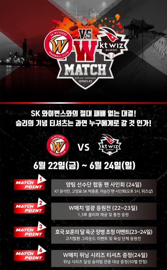 24일 경기 전, KT의 윤석민, 고영표와 SK 박종훈, 이승진의 W매치 특별 팬 사인회도 열린다.