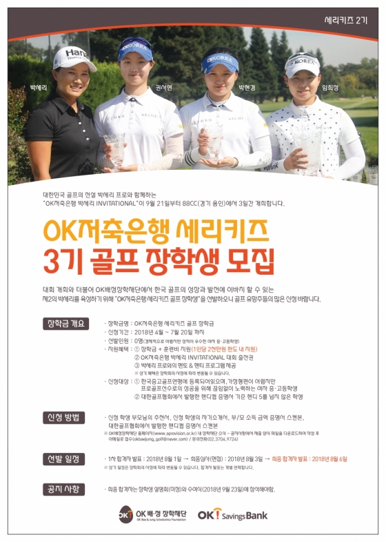 아프로서비스그룹이 출연한 OK배정장학재단이 골프장학생 'OK저축은행 세리키즈3기' 를 모집한다고 25일 밝혔다.