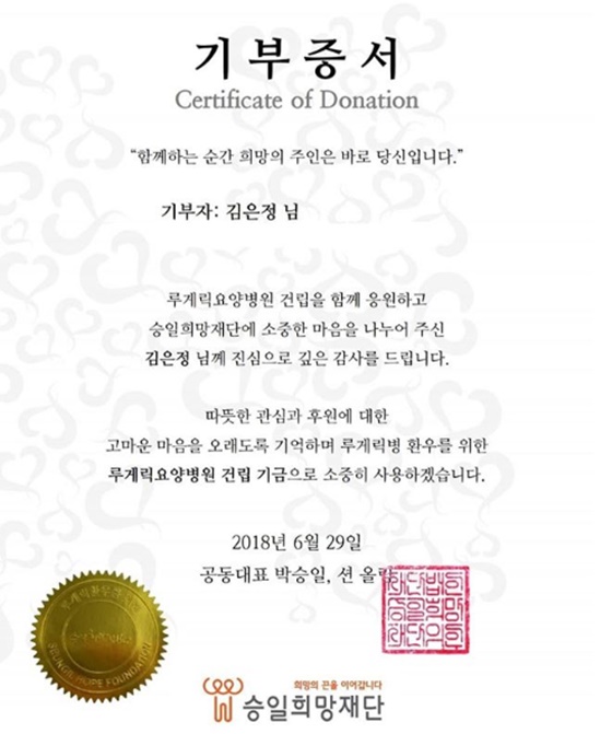 공개된 사진은 김은정이 승일희망재단에 기부한 뒤 받은 기부증서다. 이를 접한 다수의 네티즌들은 "역시 안경선배" "정말 짱이에요" "저도 안경선배 따라 꼭 기부하도록 하겠습니다" 등과 같은 반응을 보였다.