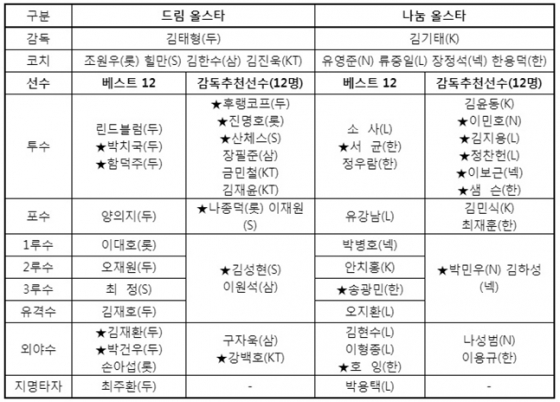 올 시즌 베스트12로 선발된 선수들을 포함해 가장 많은 올스타 선수를 배출한 구단은 두산으로 총 10명이 선발됐다. 뒤를 이어 LG가 8명, 한화 7명을 비롯해 SK와 롯데가 나란히 4명, 그리고 삼성, KT, KIA, 넥센, NC가 각각 3명씩 선정됐다.