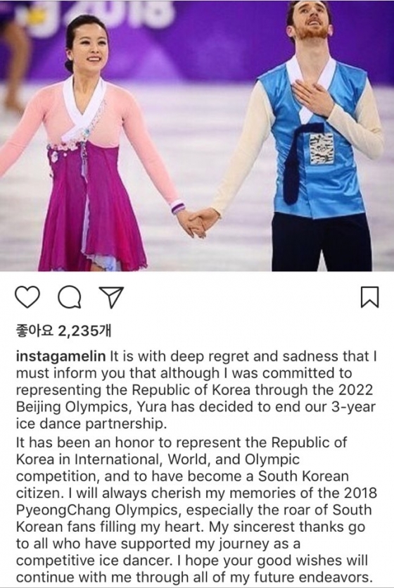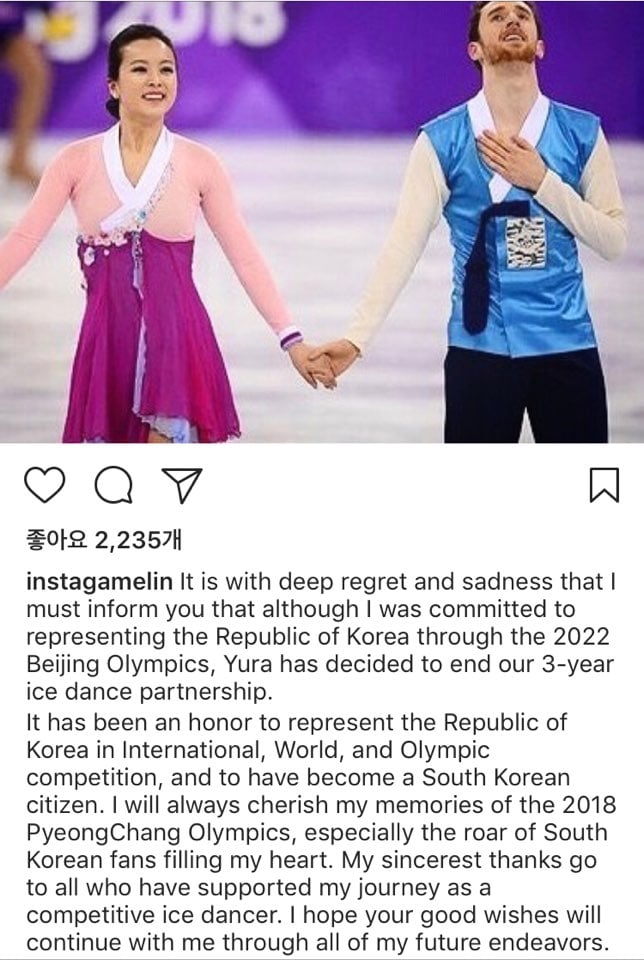 겜린은 "베이징 올림픽에서 한국을 대표할 수 없게 돼 안타깝다. 민유라가 우리의 파트너십을 끝내기로 결정했다. 평창올림픽 때 한국 팬들이 보내준 함성과 응원은 영원히 잊지 못할 것이다. 이런 소식을 전하게 돼 슬프다"고 개인 인스타그램에 올렸다.