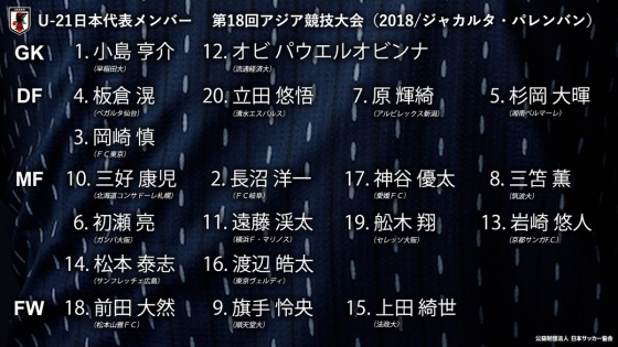 일본축구협회는 3일 공식 홈페이지 및 SNS을 통해 2018 자카르타-팔렘방 아시안게임에 나설 20인 명단을 공개했다. B조에 포함된 일본은 네팔(14일), 파키스탄(16일), 베트남(19일)과 차례로 경기를 치를 예정이다.