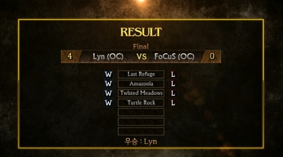 이어진 경기에서도 'Lyn'의 블레이드 마스터가 사냥 견제에 성공하며, 아이템 차이를 벌려 나갔다. 마지막 세트까지 'FoCuS'가 분전했지만, 'Lyn'이 'FoCuS'의 심리를 정확히 꿰뚫고, 완벽한 대처를 보여주며 승리를 가져갔다.