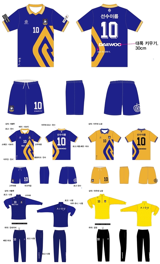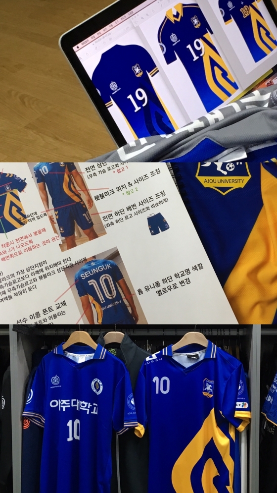 아주대 프런트가 유니폼 제작에 뛰어든 건 2016년부터. "정체성을 담자"는 한 마디에서 시작했다. 횃불 문양을 넣고, 목에 단추를 단 것도 그런 이유에서였다. 이듬해에는 더욱 욕심을 냈다. 유 씨는 "다른 학교 학생들이 봐도 '저 팀은 아주대'란 걸 한 눈에 알게 하고 싶었어요"라고 털어놨다. 반응은 다소 아쉬웠지만 옆구리에 '아주인'이란 캘리그라피까지 넣었다고.