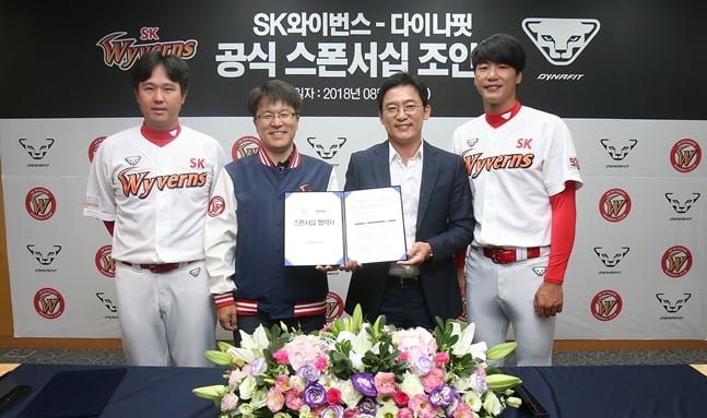 SK 와이번스가 22일 오전 11시 홈구장인 인천SK행복드림구장 대회의실에서 하이 퍼포먼스 스포츠 브랜드 '다이나핏'과 5년간 총 100억 원 규모의 선수단 용품 후원 계약을 체결했다고 밝혔다.