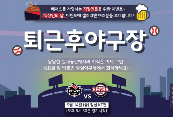 두산 베어스가 14일 잠실구장에서 열리는 홈 KT전에서 '직장인의 날-퇴근 후 야구장으로!' 이벤트를 진행한다고 12일 밝혔다.