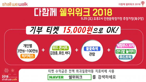 행사 참가를 위한 기부 티켓은 13일 오전 9시부터 옥션 홈페이지 검색 창에 '쉘위워크'를 검색 후 구입이 가능하며 티켓 수익금 전액은 희귀질환 아동들 치료비에 쓰일 예정이다.
