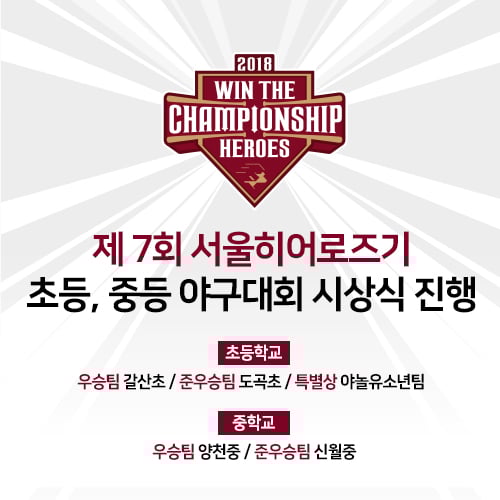 넥센 히어로즈가 오는 18일 오후 6시 30분 서울 고척 스카이돔에서 펼쳐지는 두산 베어스와의 경기에 앞서 ‘제7회 서울히어로즈기 서울시 초등학교, 중학교 야구대회’ 시상식을 진행한다.