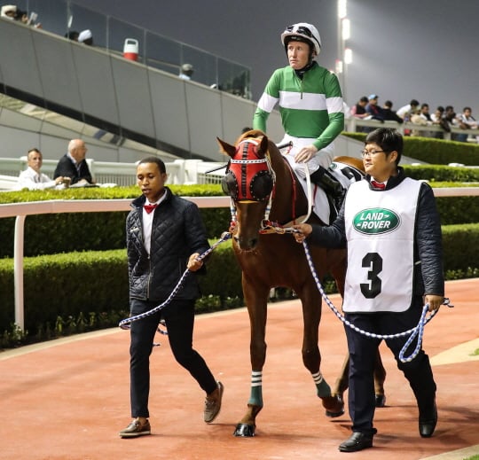 두바이 메이단 경마장 예시장을 걷고 있는 트리플나인 사진제공=한국마사회