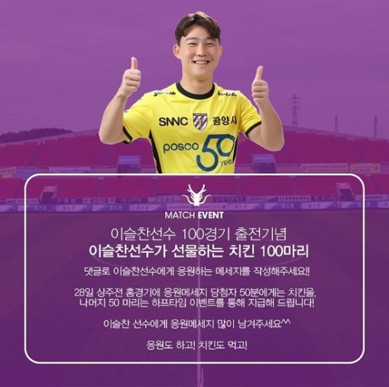 이슬찬 선수가 쏘는 치킨 100마리는 오는 28일 오후 2시 열리는 상주 상무와 홈경기에 제공한다. 대상자 선정은 전남 드래곤즈 페이스북과 인스타그램 응원 댓글 이벤트를 통해 50명을 선정, 나머지 50명은 하프타임에 진행되는 이슬찬 선수에 대해 알아보는 문자 이벤트를 통해 선정된다.