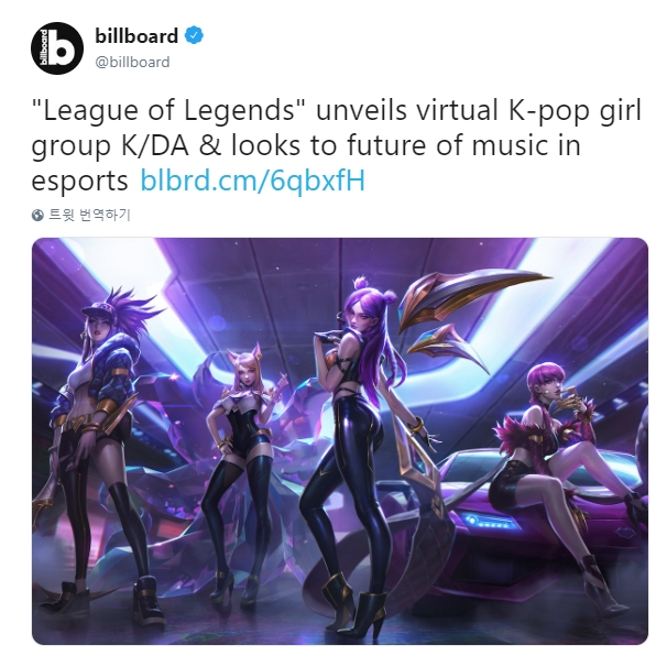 한편 미국의 대표적인 대중음악 순위 차트인 '빌보드'에서도 공식 트위터 계정을 통해 '리그 오브 레전드에서 가상의 K-pop 걸그룹인 K/DA를 공개하고 e스포츠 음악의 미래를 알렸다'는 글을 통해 그룹 K/DA와 이들의 신곡에 주목했다.