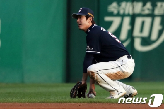 문제는 다음이다. 김성현의 타구가 좌중간으로 떨어졌을 때 김재호의 위치가 잘못됐다. 유격수는 외야수의 송구 방향을 결정한다. 2루나 홈, 3루로 향하는 라인 상에 선다. 주자 위치 파악이 어려운 외야수는 유격수를 보고 직감적으로 던지는 것이다. 스프링캠프 내내 반복 연습하는 플레이다.