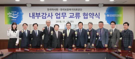한국마사회 정병국 상임감사와 보훈복지의료공단 유주봉 상임감사와 각 기관 감사 실무자 등 11명이 협약식을 위해 모였다. 전문 인력 파견, 실무협의회 구성 등 감사 활동에 상호 협력할 것을 약속했다.