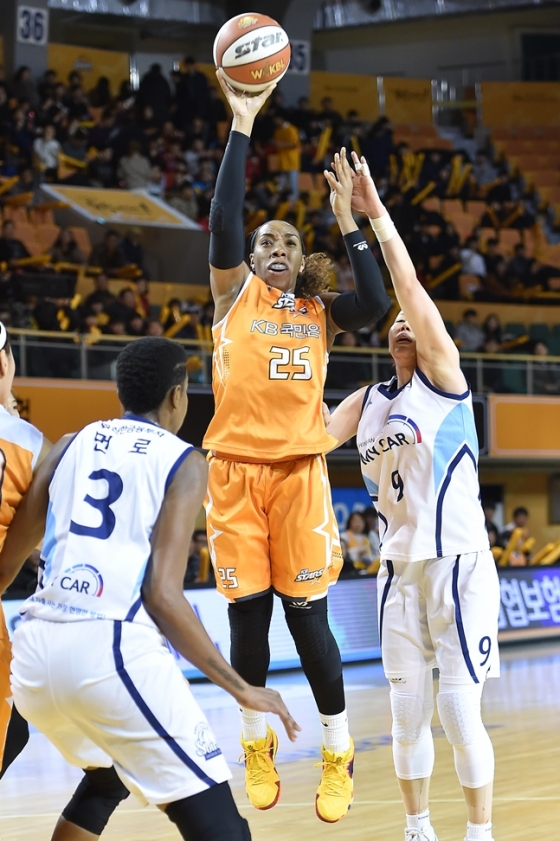 KB스타즈에는 쏜튼과 박지수의 맹활약이 있었다. 쏜튼이 18점 6리바운드 1스틸로 맹활약했고, 박지수 역시 16점 12리바운드 4도움으로 화력을 더했다. 여기에 정미란까지 3점슛 3개로 9점을 올렸다. 신한은행은 자신타 먼로가 15점 7리바운드로 분전했지만 연패를 끊지 못했다.