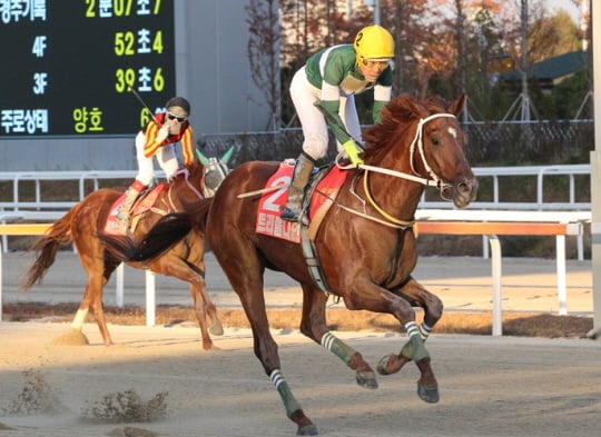 ‘돌콩’(미국, 수, 4세, R119)=지난 9월 국제경주 코리아컵에서 ‘클린업조이’, ‘청담도끼’ 등 강자를 제치고 2위를 차지했을 만큼 실력을 검증받은 신흥강자다. 다만, 지난 10월 오른쪽 앞다리 부분에 부상이 발생하여 약 2달간 휴식 후 출전이란 점을 고려해 볼 필요가 있다.