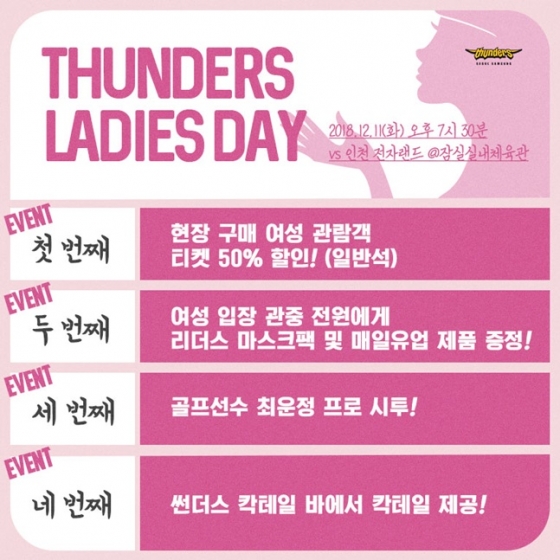 서울 삼성 썬더스가 11일 오후 7시 30분 잠실실내체육관에서 열리는 인천 전자랜드와의 홈경기를 '레이디스 데이'로 지정해 관객들을 위한 다양한 이벤트를 진행한다.