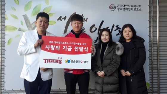 KIA 타이거즈는 지난 10일 내야수 최원준, 밝은안과21병원 김근오 원장 등과 함께 광주시 동구 소태동에 위치한 대한사회복지회 영아일시보호소를 찾아 '사랑의 기금' 등을 전달했다.