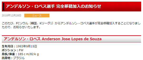 안델손은 2016~2017년에 산프레체 히로시마에서 활약해 J리그가 익숙하다. 그는 2년 동안 히로시마에서 J1리그 39경기를 뛰어 12골을 기록했다.