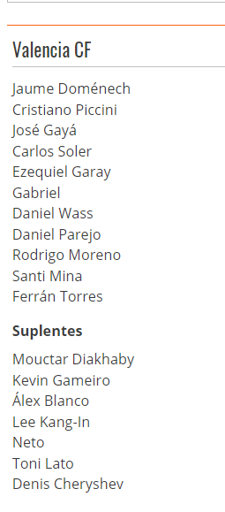 발렌시아는 4-4-2 포메이션을 들고나왔다. 최전방에는 산티 미나와 호드리고 모레노가 출전했고, 미드필더진에는 다니엘 와스, 카를로스 솔레르, 다니 파레오, 페란 토레스가 이름을 올렸다. 수비진에는 크리스티아노 피치니, 에즈퀴엘 가라이, 가브리엘, 호세 가야, 골키퍼 장갑은 도메네크가 착용했다.