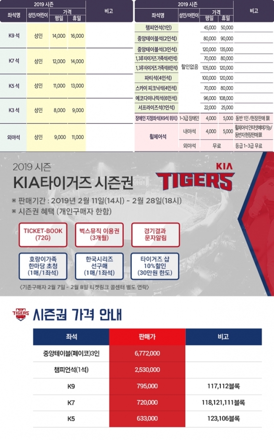 KIA 타이거즈 홈 입장료 및 시즌권 가격. /표=KIA 타이거즈 제공