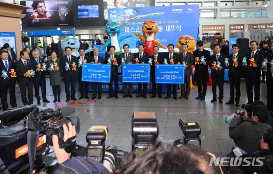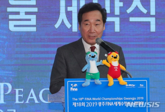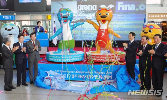 2019 광주세계수영선수권대회를 150여 일 앞두고 열린 마스코트 조형물 제막식에 이낙연 국무총리를 비롯해 정부 및 국회 고위인사들이 참석해 성공 개최를 기원했다.