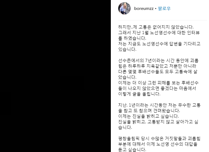 그러면서 "하지만 제 고통은 없어지지 않았다. 그래서 지난 1월 노선영에 대한 인터뷰를 했다. 저는 지금도 노선영의 답변을 기다리고 있다. 선수촌에서의 7년이라는 시간 동안 괴롭힘은 하루하루 지옥 같았다. 저뿐만 아니라 다른 몇몇 후배 선수들도 모두 고통 속에 살았다"면서 "이제는 더 이상 그런 피해를 보는 후배 선수들이 나오지 않았으면 좋겠다는 마음에서 이렇게 글을 올린다"고 밝혔다.