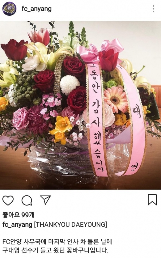 안양은 21일 공식 SNS를 통해 꽃바구니 사진 하나를 게시했다. 적힌 문구는 구대영 이름과 함께 "그동안 감사했습니다". 이적을 확정한 구대영은 마지막 인사 차 이 꽃바구니를 들고 구단 사무실에 들렀다. 같은 날 수원 삼성은 "전천후 측면 수비수 구대영 영입"이라고 공식 발표했다.