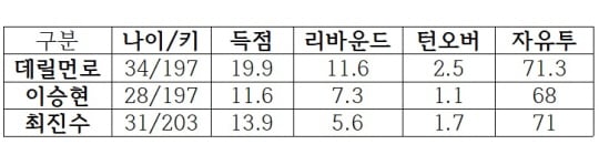 데릴먼로 다재다능하면서 모두 부분에서 상위에 랭크되어 있는 실력있는 선수다. 올 시즌 평균 5.4 어시스트를 기록중인데 어시스트 랭크 1위 전자랜드 박찬희 선수 6개로써 가드선수들이 보통 랭크되어 있는 수상부분인데 전체 3위에 올라있다는 점이 대단하다. 센터포지션에서 어시스트 능력까지 좋다는 점은 수비하는 입장에서 정말로 까다로운 점이다. 더블팀 상황에서 외곽 기회를 만들어주고 골밑에서 좋은 위치 선정으로 득점까지 가능하다.