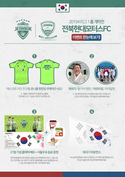 전북현대는 오는 3월 1일 금요일 오후 2시 지난해 FA컵 우승팀 대구FC와의 경기를 시작으로 2019 K리그 대장정에 돌입한다. 3월 1일 개막전을 치르는 전북현대는 3.1 운동 100주년과 개막전을 기념해 다양한 행사를 준비했다.
