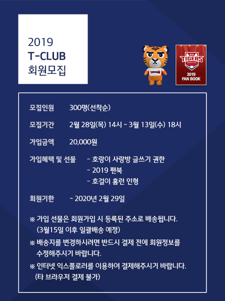 스포츠야구KIA 타이거즈, 홈페이지 'T클럽' 회원 모집발행 : 2019.02.25 ・ 19:06김동영 기자KIA 타이거즈가 2019시즌 홈페이지 'T클럽' 회원을 모집한다. /사진=KIA 타이거즈 제공KIA 타이거즈가 2019시즌 홈페이지 'T클럽' 회원을 모집한다.모집 인원은 300명이며 가입비는 2만원이다. 28일부터 다음달 13일까지 구단 홈페이지 팝업창을 통해 신청하면 되고, 팬북과 호걸이 인형을 가입 선물로 증정한다.T클럽은 1년 회원제로 운영되며 홈페이지 내 모든 메뉴를 이용할 수 있다.<저작권자 © 스타뉴스, 무단전재 및 재배포 금지>daumKIA타이거즈T클럽추천 기사좋아요 스포츠-야구의 인기 급상승 뉴스스포츠-야구의 최신 뉴스