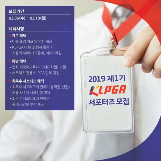 제1기 KLPGA 서포터즈로 선발되면 KLPGA 대회장 출입 비표와 명함, 서포터즈 전용 단복이 지원되며 최우수 서포터즈에게는 소정의 부상과 신입 정직원 채용 시 서류전형 면제 등 다양한 혜택이 주어진다.