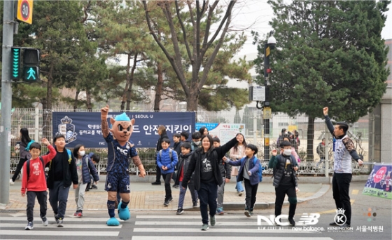 서울 이랜드는 '레울'을 십분 활용하며 활동에 임했다. '레울'은 학생들과 신호등을 같이 건너고, 함께 사진을 찍으며 신학기에 들어가는 학생들에게 즐거움을 선사했다.
