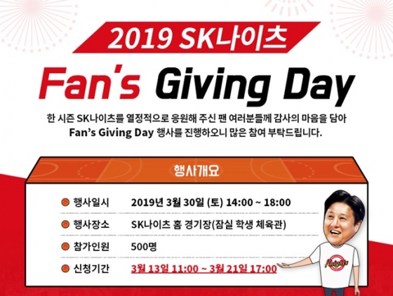 'SK나이츠, 팬스 기빙데이'에 참가하고자 하는 팬들은 오는 13일 오전 11시부터 21일 오후 5시까지 SK나이츠 홈페이지에 신청하면 된다.