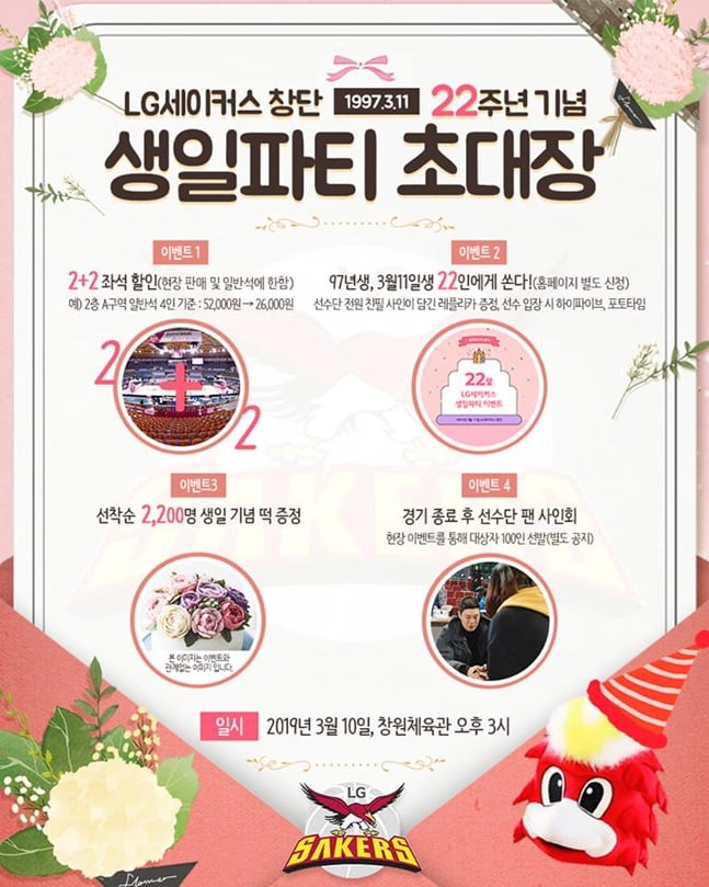 먼저 창단 22주년을 기념해 이날 입장객 전원을 대상으로 일반석에 한해 2+2 좌석 이벤트를 진행한다. 입장객 선착순 2200명에게는 생일 기념 떡을 제공한다.