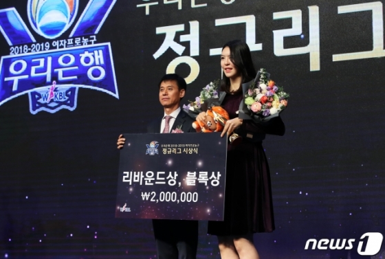 박지수는 11일 서울 여의도 63빌딩컨벤션센터에서 열린 우리은행 2018~2019 여자프로농구 정규리그 시상식에서 리바운드상과 블록상에 이어 우수 수비선수상과 윤덕주상을 수상했다. 유력한 MVP 후보이기도 하다.