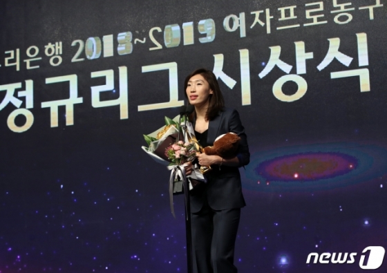 청주 KB스타즈 '대들보' 박지수(21)가 우수 수비선수상과 윤덕주상을 받았다. 윤덕주상은 2연패. 우리은행의 베테랑 임영희(39)는 모범선수상을 받았다.