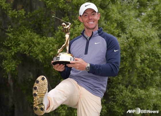 플레이어스 챔피언십 우승을 차지한 로리 매킬로이가 트로피와 함께 자신의 골프화 황금빛 밑창을 들어 보이고 있다. /AFPBBNews=뉴스1
