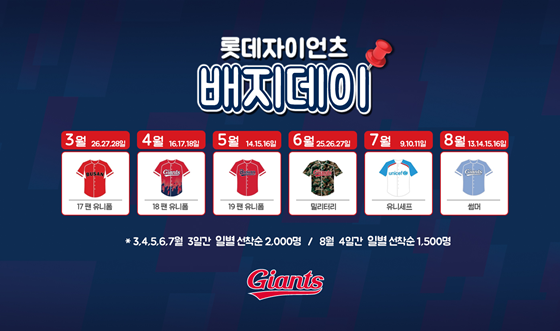 롯데는 "배지데이는 일회성으로 끝나지 않고 매월 특정 시리즈를 통해 8월까지 총 6회 진행할 예정"이라며 "역대 팬사랑 유니폼 3종과 올해 새롭게 선보이는 썸머 유니폼 등 총 6종의 다양한 배지를 매월 만나볼 수 있다"고 덧붙였다.