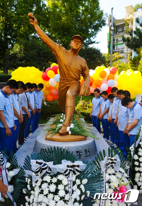 2015년 열린 최동원 감독 4주기 추모행사에서 사직중학교 야구부 학생들이 묵념을 하고 있다. /사진=뉴스1
