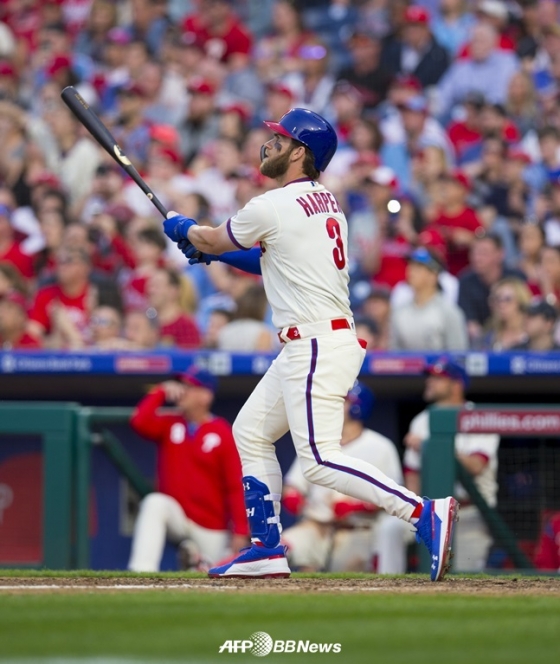 하퍼가 필라델피아 이적 1호 홈런을 터뜨렸다. 3번 타자 겸 우익수로 선발 출장한 하퍼는 6-5로 앞선 7회말 우중월 솔로 홈런을 폭발시켰다. 3타수 1안타 1타점. 무려 465피트(약 142m)짜리 대형 홈런이었다.
