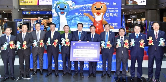 광주광역시와 수영대회 조직위원회는 100여 일 앞으로 다가온 광주수영선수권대회 성공 개최를 위한 전국적인 분위기 조성을 위해 2일 오후 KTX 용산역 광장에서 대회 마스코트인 ‘수리’와 ‘달이’ 대형 조형물 제막식을 가졌다.