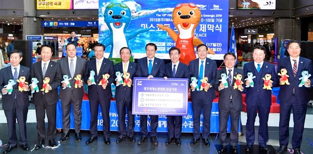 2019광주세계수영선수권대회 개막 D-100일을 앞두고 서울 용산역에 대회 마스코트인 수리·달리 조형물이 세워졌다.