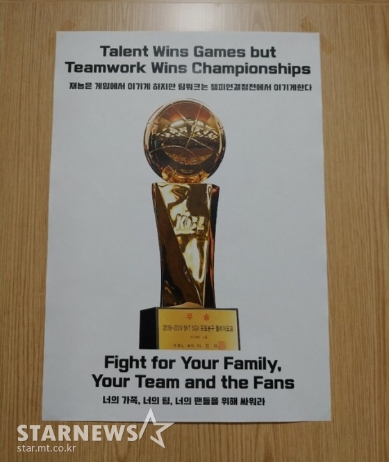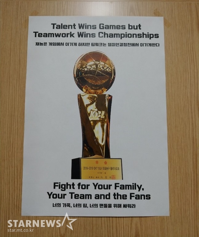 끝이 아니다. 전자랜드 선수 한 명 한 명의 라커에 포스터가 하나씩 붙어 있었다. 여기에는 트로피 사진과 함께 "재능은 게임에서 이기게 하지만, 팀워크는 챔피언결정전에서 이기게 한다", "너의 가족, 너의 팀, 너의 팬들을 위해 싸워라"라는 문구가 있었다.