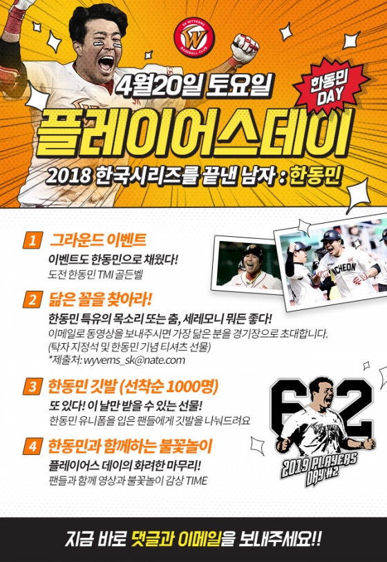 SK 와이번스가 오는 20일에 열리는 NC 다이노스와 홈경기에서 한동민(30)을 주인공으로 한 ‘한동민 플레이어스 데이(이하 한동민 데이)’ 이벤트를 실시한다.