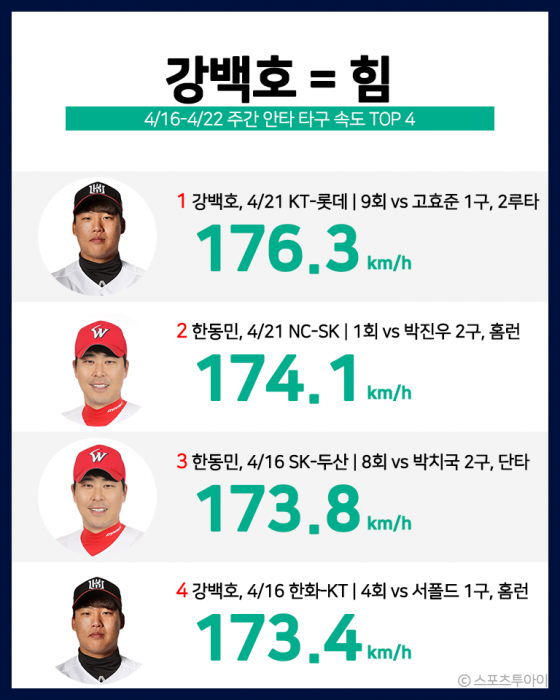 강백호는 주간 안타 타구 속도 4위에도 이름을 올렸다. 16일 한화전에서 4회 워윅 서폴드의 초구 커브를 받아쳐 홈런을 뽑아냈다. 우측 담장을 넘긴 이 홈런은 타구 속도 173.4km로 측정됐다.