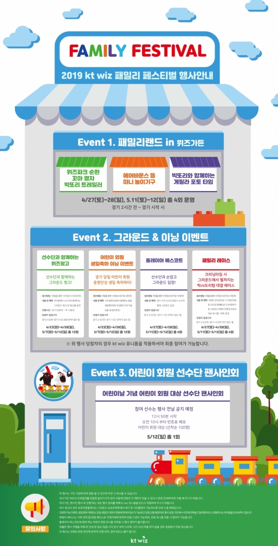 22일 구단에 따르면 '패밀리 페스티벌'은 오는 23일 NC전부터 5월 12일 키움전까지 수원 KT 위즈파크에서 열리는 두 번의 홈 6연전을 통해 진행된다.