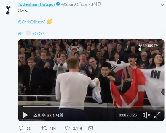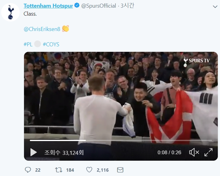 에릭센의 활약은 여기서 그치지 않았다. 토트넘 공식 트위터는 경기 후 그의 행동을 주목했다.
