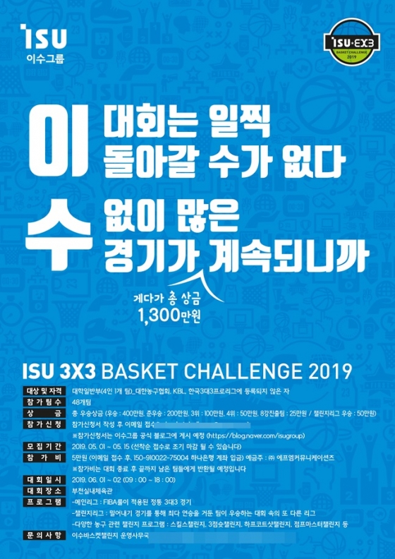 이수그룹은 오는 6월 1일과 2일 양일간 부천실내체육관에서 대학일반부 아마추어 48개팀을 대상으로 하는 3대3 농구대회 '이수 3X3 바스켓 챌린지(Basket Challenge) 2019'를 개최한다고 밝혔다.